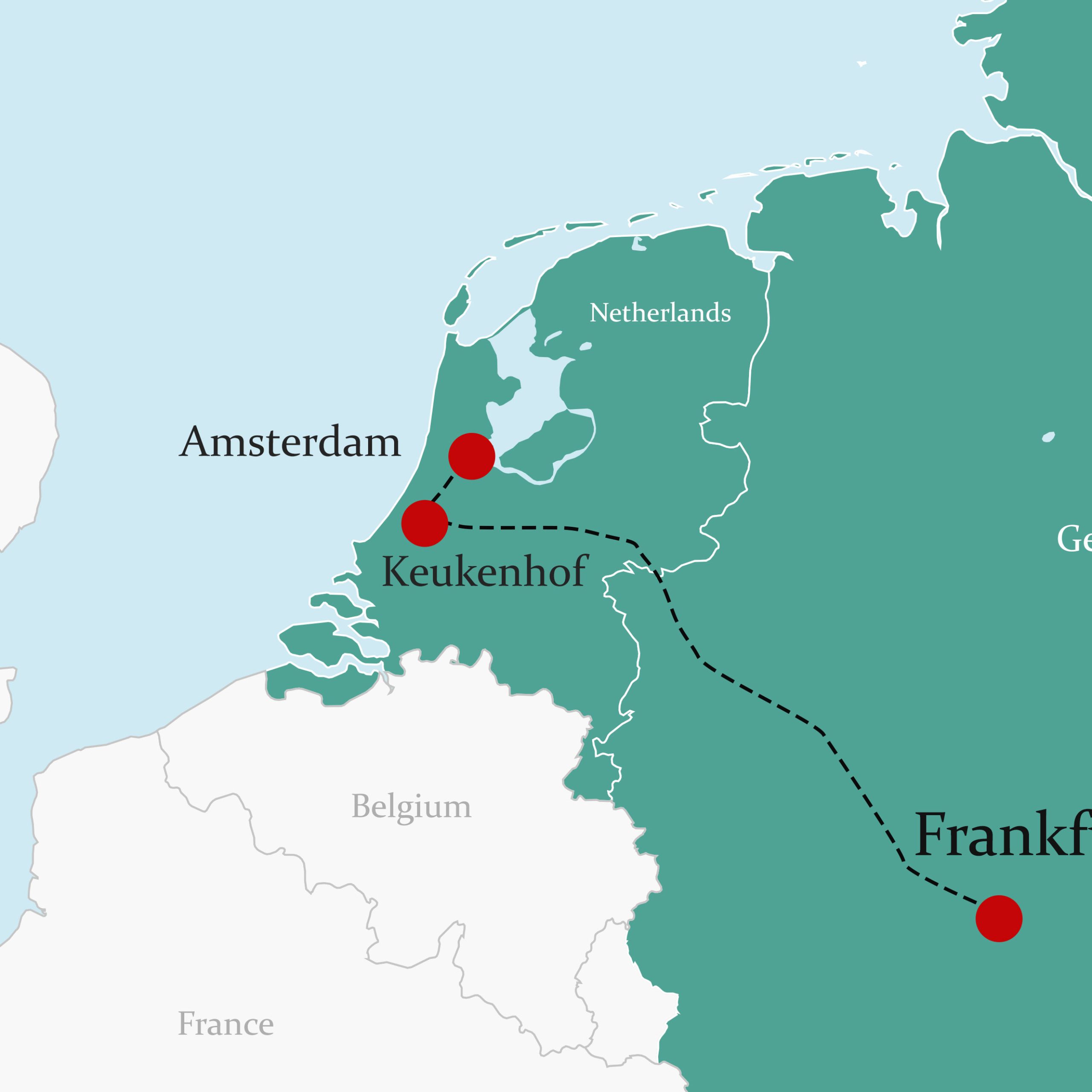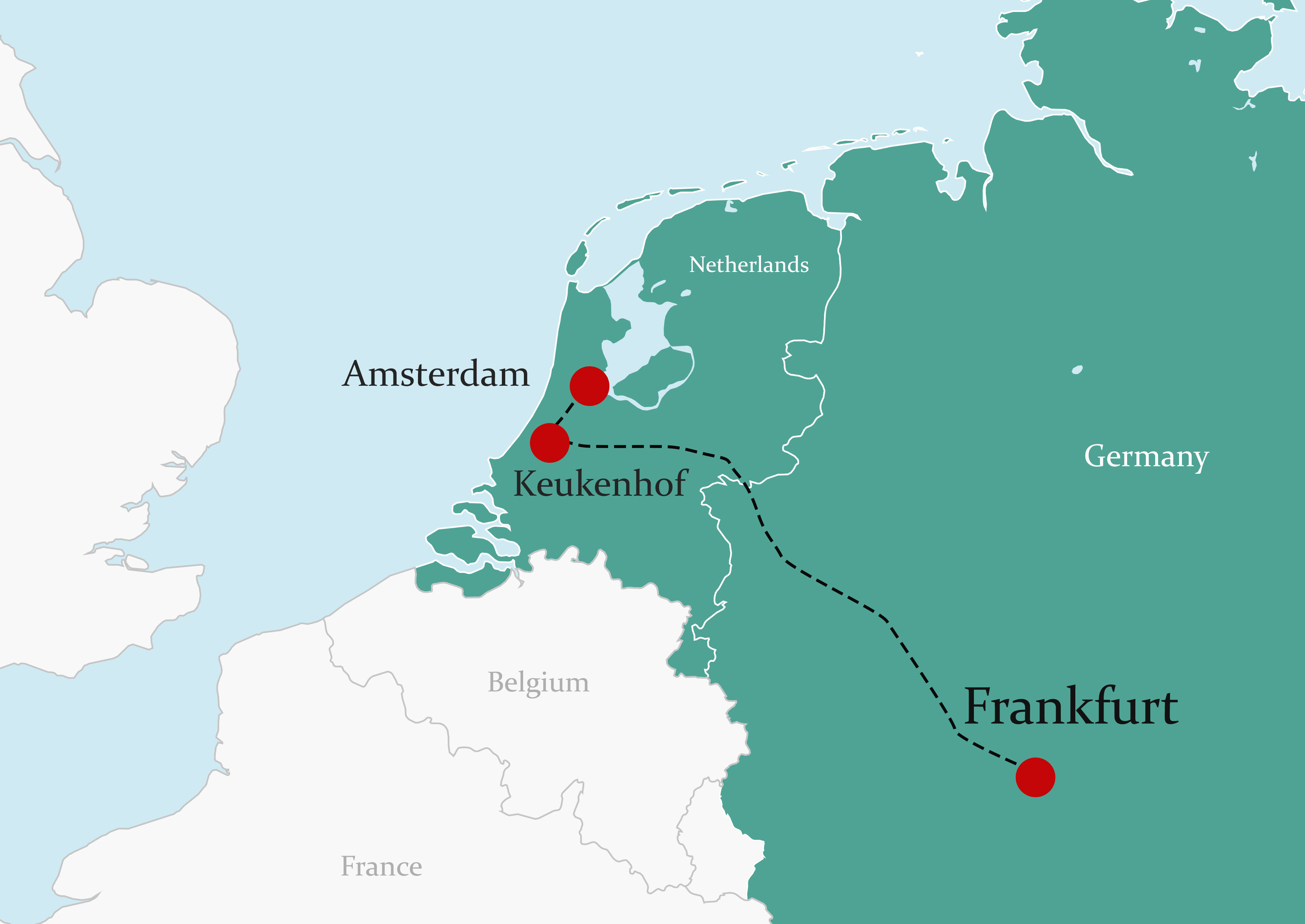 Reiseroute:✈ Frankfurt 🚌 Neukenhof 🚌 Amsterdam ✈
