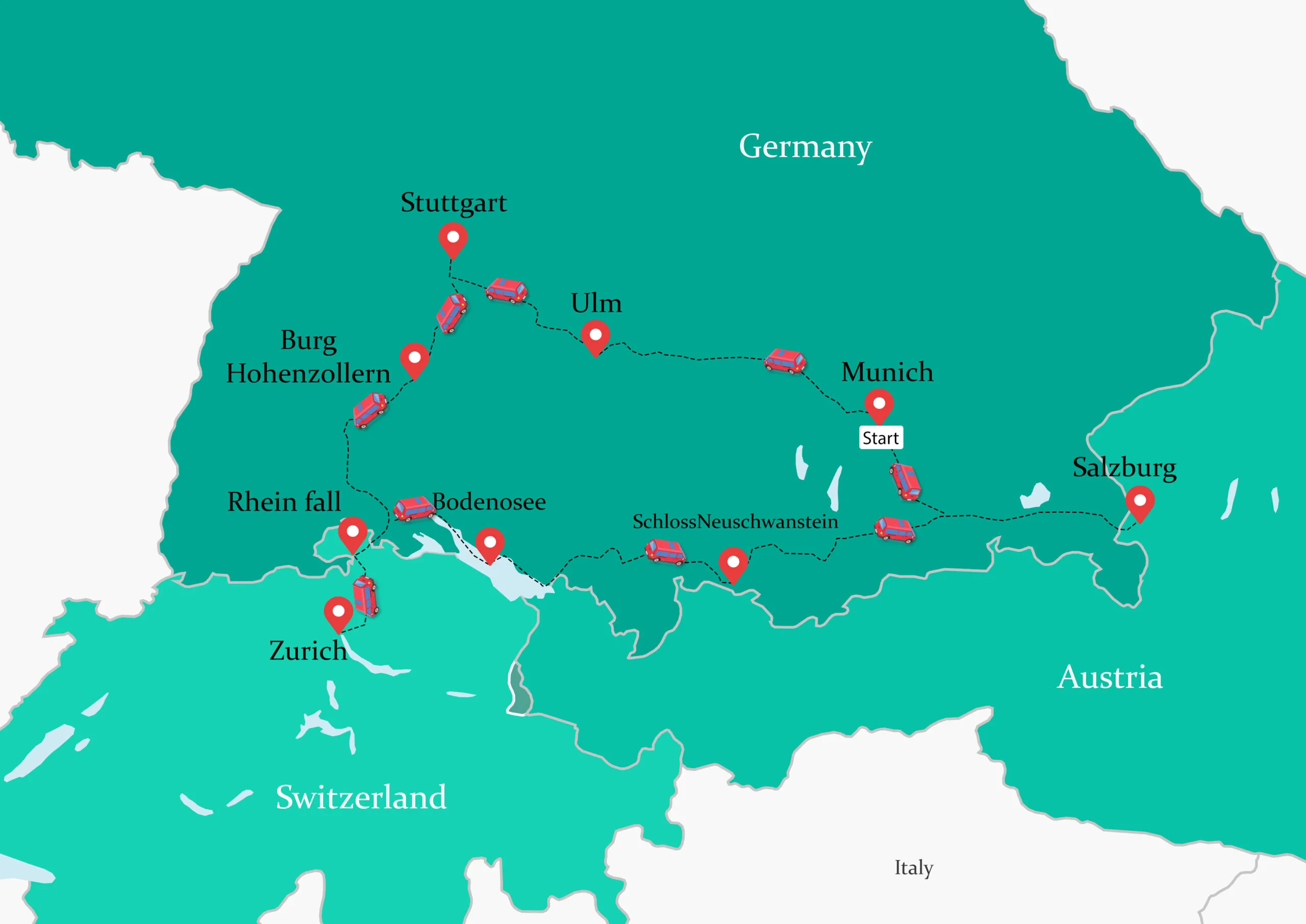 Unser zweites Ziel ist der Rhein mit seinem berühmten Wasserfall, der zugleich der größte Wasserfall Europas ist. Am Ende des Tages erreichen wir Zürich und verbringen dort zwei Nächte.