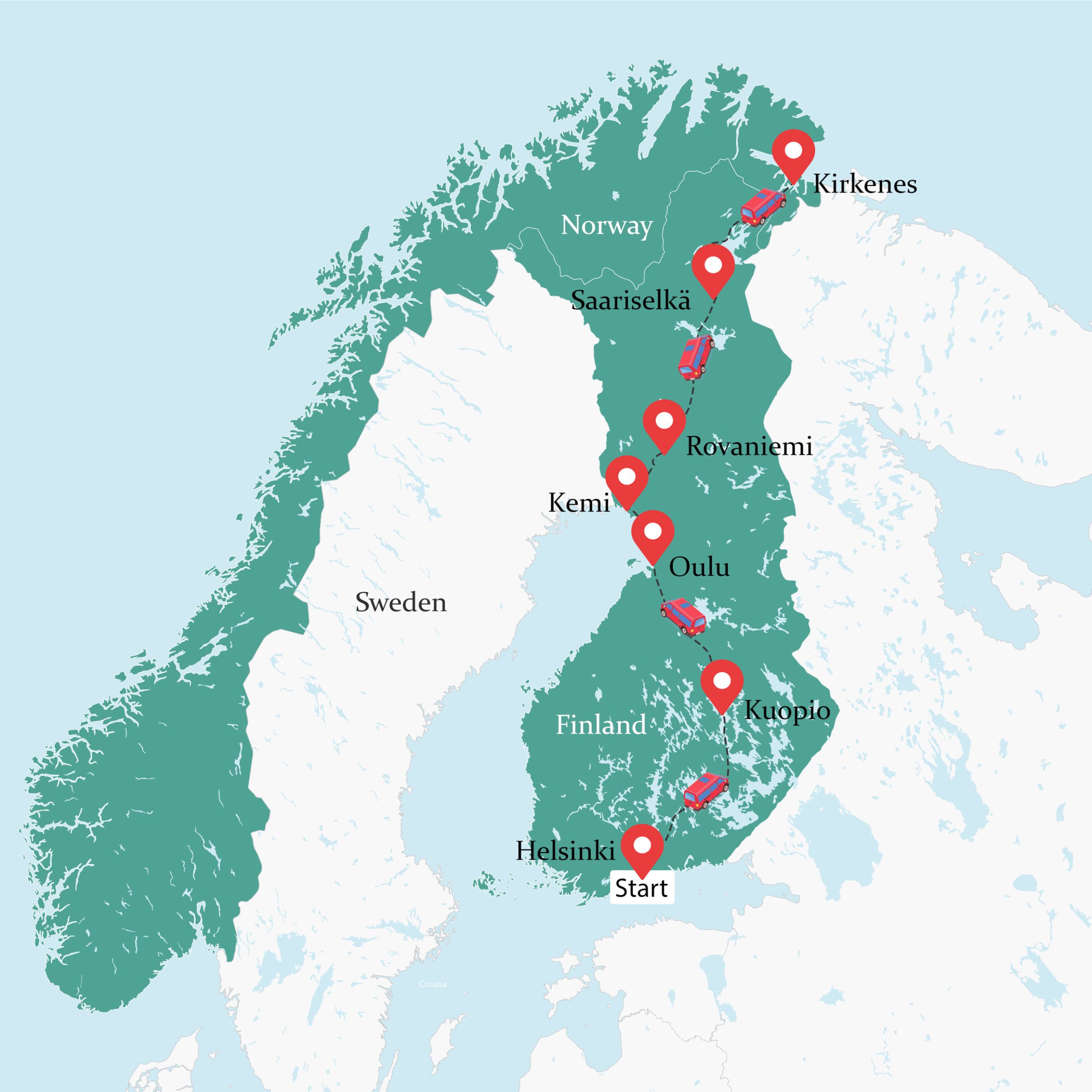 ✈ Helsinki, Finland ✈ Kuopio, Finland ✈ Oulu, Finland ✈ Kemi, Finland ✈ Rovaniemi, Finland ✈ Saariselkä, Finland ✈ Kirkenes, Norway ✈ Saariselkä, Finland ✈ Kemi, Finland ✈ Jyväskylä, Finland ✈ Helsinki, Finland
